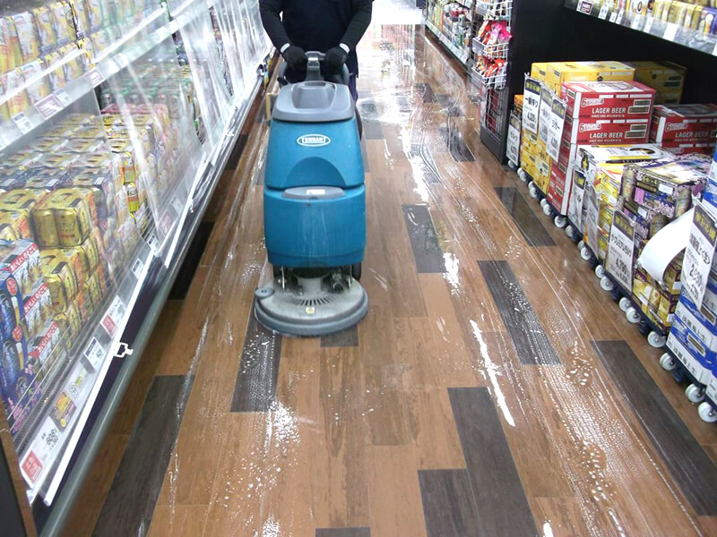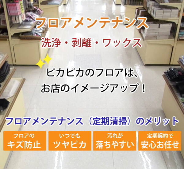 出入りの激しいお店などは、定期的なフロアメンテナンスをオススメしています。いつでも清潔が保たれて、お客様にも好印象です。また、定期的なワックスがけ等で汚れがひどくなりません。当社では、お客様のご要望に応じて、定期清掃の回数やメンテナンス内容を決めさせていただきます。ぜひご相談ください。